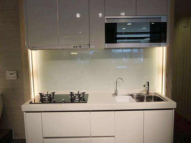 一字型廚具,有櫻花三機,廚櫃也是櫻花的