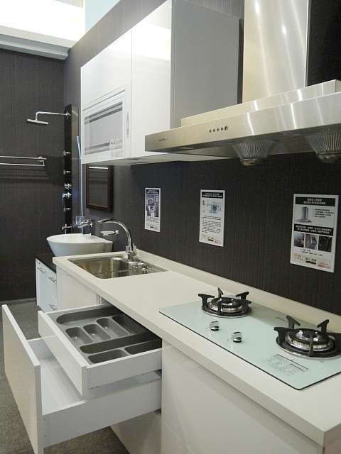 一字型廚房,包括櫻花的三機,選用T型直吸式抽油煙機讓空間更加現代感,櫃體全部有做緩衝,並用鋼琴烤漆的門板,水槽使用北極熊專利防蟑七件式大水槽。