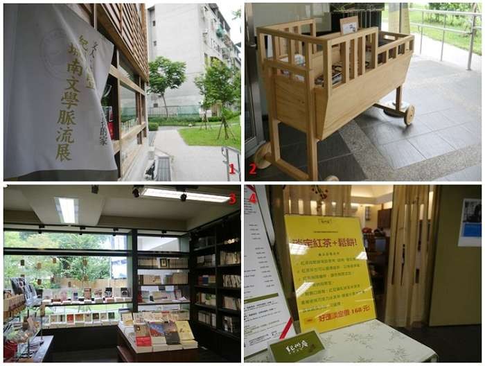 下圖1是現在紀州庵正在進行的展覽旗幟,圖2是提供大家免費交流童書的書車,圖3是紀州庵內販售的書籍與特色商品,圖4代表著文學也趕上網路火紅的話題~~淡定紅茶+鬆餅只要168元,幫助你思考、談判、穩定感情!ˊ_>ˋ