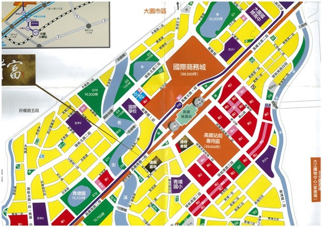上圖中紅色的區塊就是規劃為商業用地,而橘色的區塊是由高鐵局徵收的地,規劃統一開發,未來會有醫院、飯店、商城…等規畫。而高鐵站的旁邊就是預計明年就會通車的機場捷運線A18站。另外,大家可以看到圖中的老街溪兩旁有多座公園,其中在左下角處有兩大塊綠地,一個有10,700坪,另一個青塘園有19,200坪,這個區域是低密度開發的區域,因此綠地也特別多。