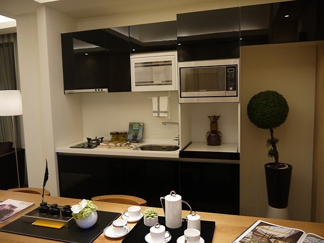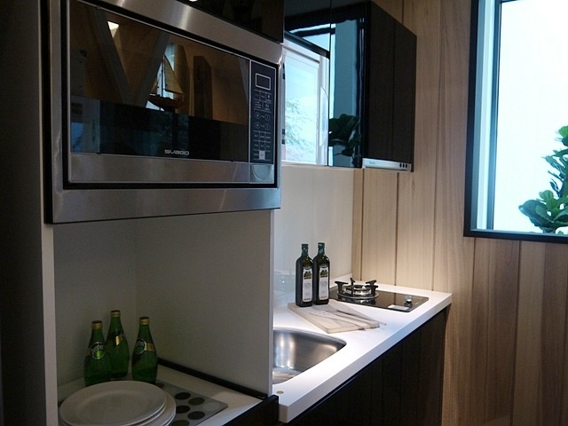 簡單的一字型廚房櫻花三機+微波爐,小巧但應有盡有,放小家電的空間也都考慮到