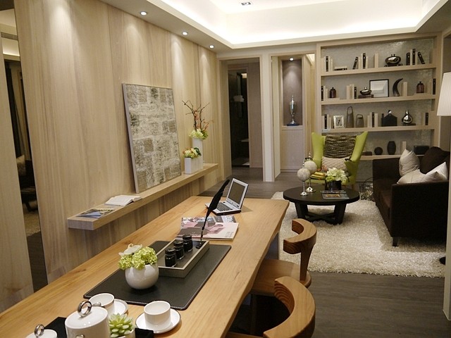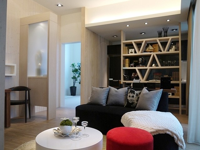 A戶規劃1+1書房,建商樣品屋虛化掉書房與廚房的隔間,改以別致的置頂展示書櫃,打造全開放空間