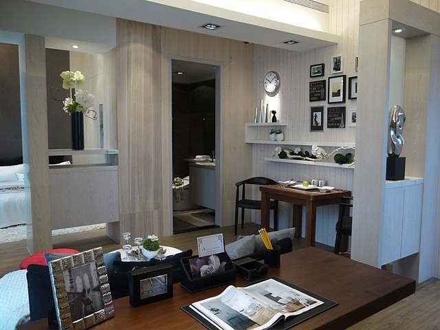 換個角度!站在書房可以看到客廳、餐廳、浴廁、臥室。這間樣品屋打造的是單身新貴或夫妻兩人的空間,所有空間除了浴廁之外,都是開放式的