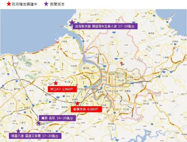 也因為政府拋磚引玉推出合宜住宅,許多民間知名建商看到這股首購及中低收入戶者的購屋渴望與潛力,紛紛規劃在新北市及桃園推出1字頭平價住宅,包括:興富發在淡海新市鎮推出每坪17~18萬住宅、長虹建設在鶯歌推出每坪19~20萬住宅、遠雄建設在桃園八德推出每坪17~20萬住宅,希望搶攻首購族群。由推案的基地可以發現,無論官方或民間的合宜住宅,都與大台北交通建設接軌,方便青年就業及生活的需求,也是以未來捷運的利多吸引台北客購買,訴求未來捷運的房市錢景!