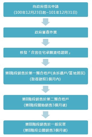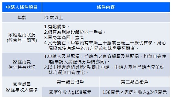 合宜住宅的申請資格為家庭年收入在一定標準以下,目前無自有住宅的家庭。其中家庭年收入分兩種等級,第一類為平均低於台北市50%分位點之平均收入以下(低於158萬年收入),此類合格戶可優先向建商申購,若尚有餘屋才開放第二類合格戶申購,目的是希望優先保障低收入之家庭戶。