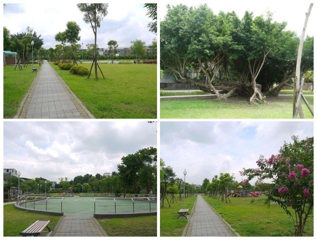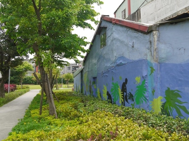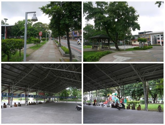 文化創意園區的外面是一個簡易公園,簡單的綠地加上貼心的兩大鐵棚,讓居民就算在下雨天、艷陽天,也有個半戶外空間和左鄰右舍聊天、下棋、跳舞、太極、運動…等,小朋友也有可以跑跳的地方,使用率非常高。而且棚內展示了很多很多台灣的山林美景,拍出福爾摩沙之島的四季與顏色