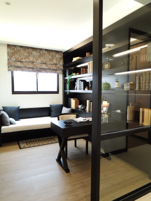 ↑↑↑最靠近客廳的房間,採用落地玻璃門,打造了一間半開放式的書房,感覺很雅緻。