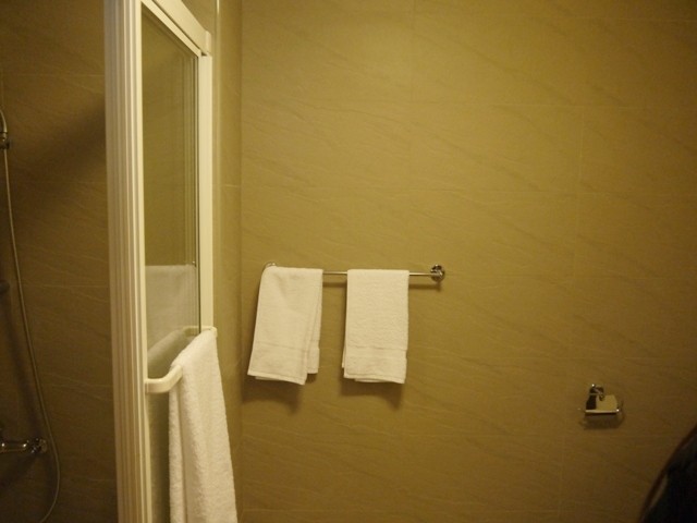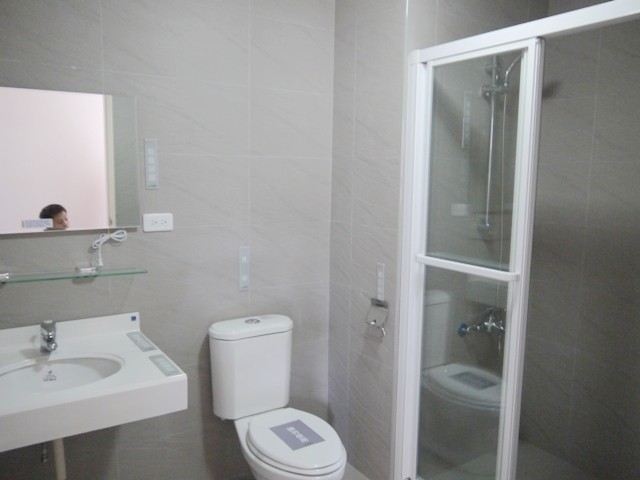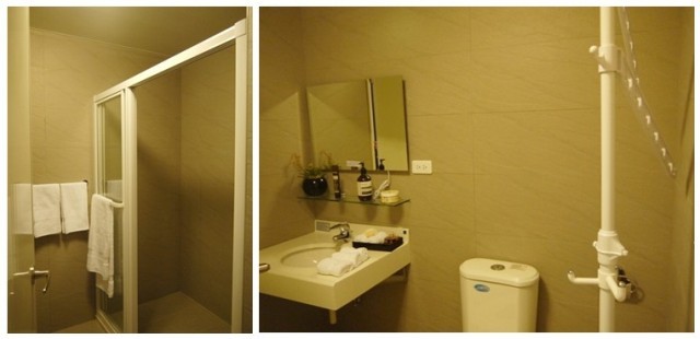 廁所沒有對外窗,左邊照片是廁所一開門的樣子,看到的是一個乾濕分離的淋浴空間,門後面是洗手檯與馬桶,等於開門會打到正在用洗手檯的人 ^^|||