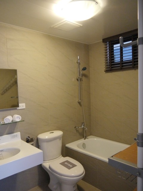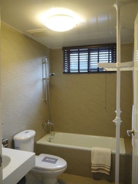 客廁空間有點不好取景,這是從門口看到的樣子,左手邊是淋浴空間,右手邊是洗手檯與馬桶,一樣開門會打到在洗臉的人,沒有對外窗