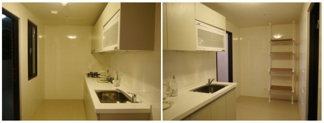 每個空間都是配備一字型廚房,櫃體及面板都是平價的材質,但是三機是林內或豪山二選一,並從廚房通往陽台