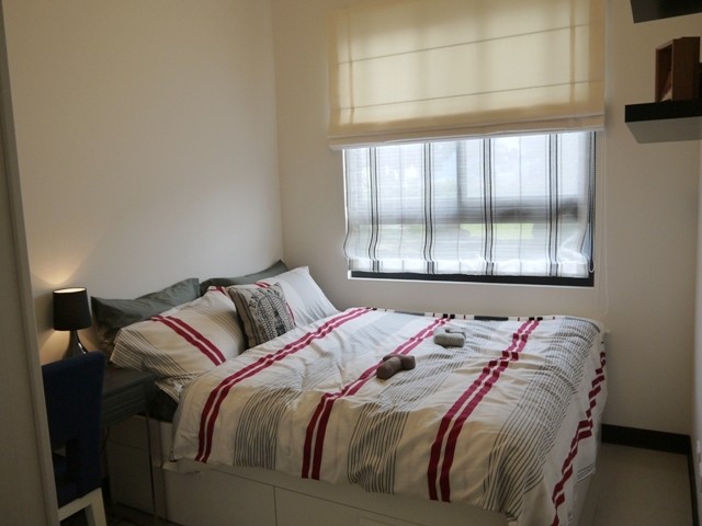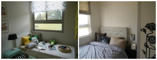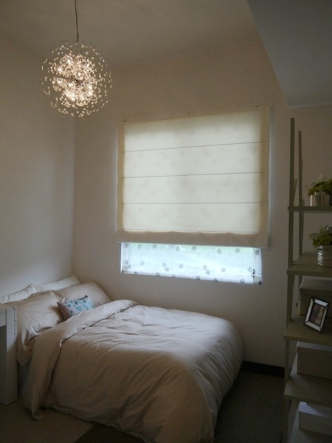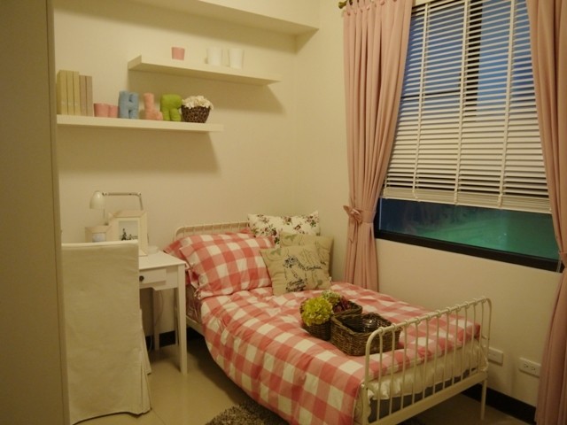 最小的一間房只能靠邊擺個單人床,但是頭頂上的樑柱小很多,有個床頭櫃就沒有風水問題了~~