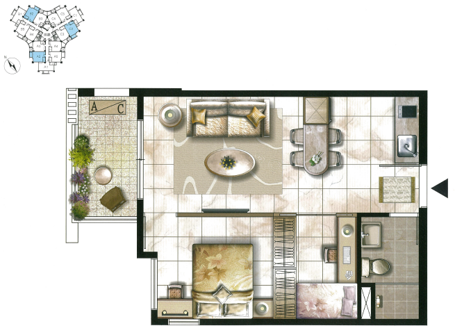 從平面圖就可以清楚看到麗景特殊的設計,中間的梯廳是三角形,規畫有三部電梯、兩支樓梯;三角形的三邊在各自發展出一個「凸」字型的區塊,每邊都有5戶,因此每層總共有15戶,總戶數為174戶。中間共有的走道,也是設計成長形的廊道,這是飯店式的設計。