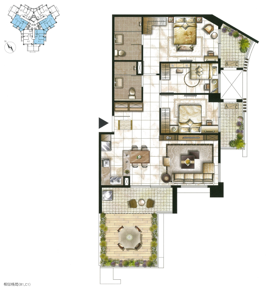 那麼14樓呢?頂樓的規劃一層只有6戶,面積也較其他樓層的格局大上一倍,而且除了原有的三個陽台之外,還有一個休閒陽台,不過小編倒是比較希望可以布置成空中花園。