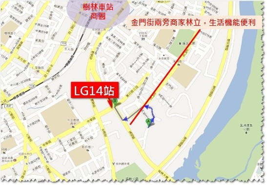 台北市捷運工程局的規劃中捷運路線說明中看到,萬大-中和-樹林線第二期的LG14站位於溪城路與中華路路口附近,目前第一期已經動工,讓許多來購屋者充滿期待。從Google地圖計算該路口到金門街369巷中段步行距離約550公尺,的確是很誘人的捷運、學區、河岸、公園的金磚板橋建案,但規劃中路線代表還沒有底定,而且不知道是幾十年後的事情了~大家還是要理性的看待捷運這利多,考量該生活圈、房價是否為自己可接受的喔!