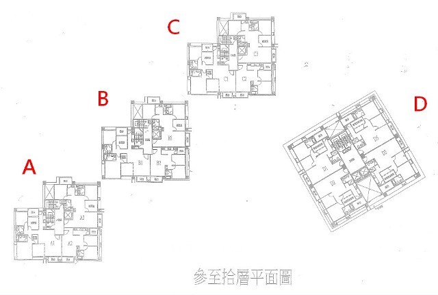 以下為標準層3~10F的平面規劃圖。A~C棟皆是一層3戶的格局,共有一部電梯,分別有2~4房的規劃,戶戶有雙陽台、廁所皆有對外窗,除2房格局外,都擁有雙衛浴。A棟是全三房格局,一層4戶,共用兩部電梯,每戶都有雙陽台,但是只有主臥衛浴有對外窗,格局非常方正。