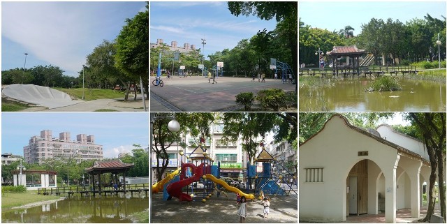 走入溪北公園可以看到生態水池,大家會倚靠著涼亭的欄杆看著風景,小朋友的玩樂區、青少年的籃球場都有,大家猜猜看右下方古色古香的建築是什麼呢?