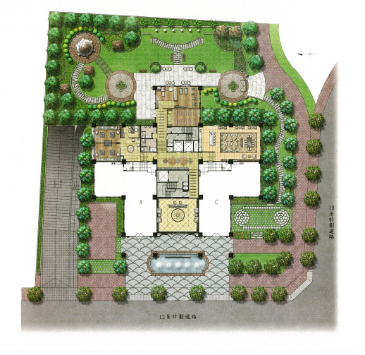 ↑↑↑新月+前方是12米的計畫道路,又有退縮做中庭噴泉造景。