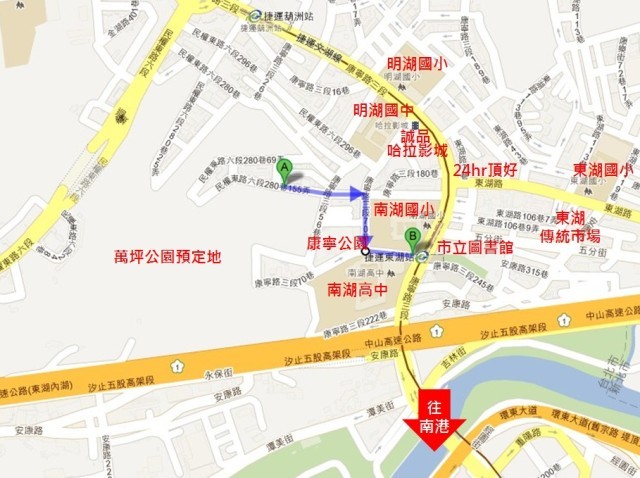 ↑↑↑依據Google地圖計算,仰山基地步行到捷運東湖2號出口約500公尺,約5分鐘步行時間。