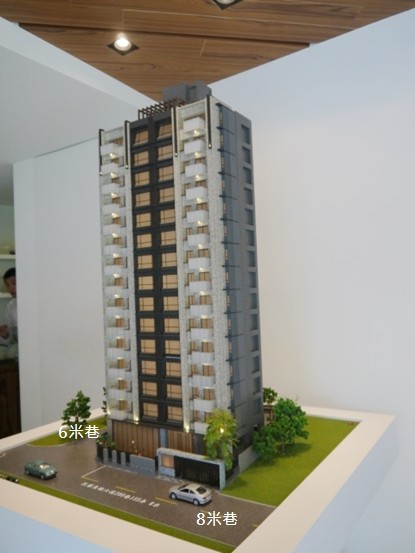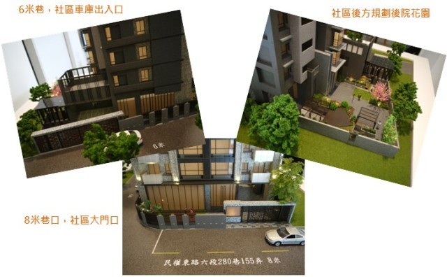 ↑↑↑建築外觀模型,社區正對萬坪公園預定地,為8米巷,旁邊6米巷則有車道出入口