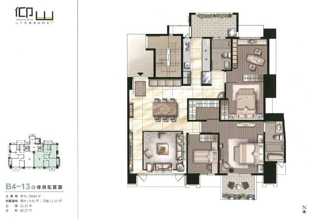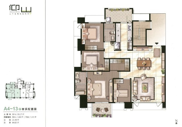 一層2戶的仰山,A戶格局比B戶大1坪,規劃4房格局,大家可以參考以下傢配圖,4房2廳2衛1廚雙陽台,可把客廳旁的小房間做成開放式的書房。