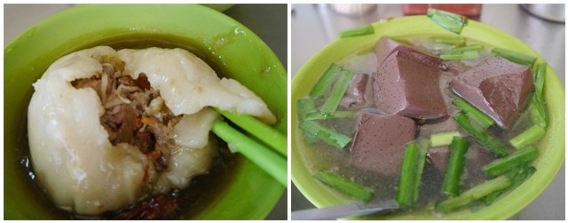 點了一顆肉圓+豬血湯,肉圓的醬料有點微甜不會死鹹,裡面的餡料非常紮實,除黑豬肉外還有筍絲與紅蘿蔔絲,肉圓的皮像客家的菜包(?),厚實的、嫩嫩的、QQ的,很有飽足感;豬血湯內的豬血及韭菜給的非常大方,一端上桌馬上嚇到小編,放這麼多料可以賺錢嗎?豬血料多味美,讓小編雖然大熱天在路邊沒有冷氣吹,也把這一碗湯嗑光光!!!