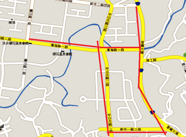 ↑↑↑目前淡海新市鎮較有發展的區域,為紅線路段。(2012/8)
