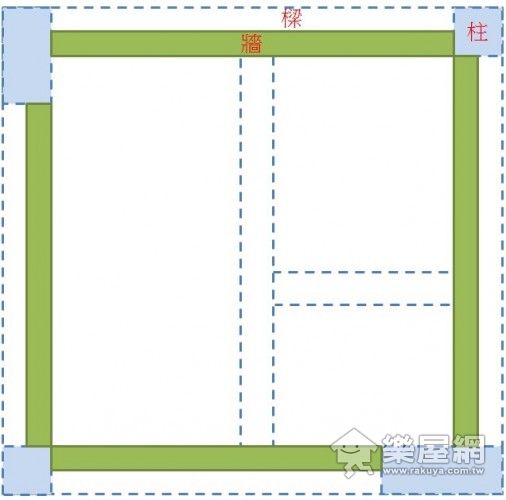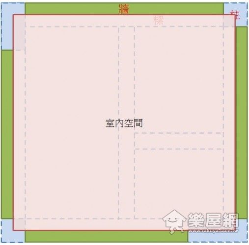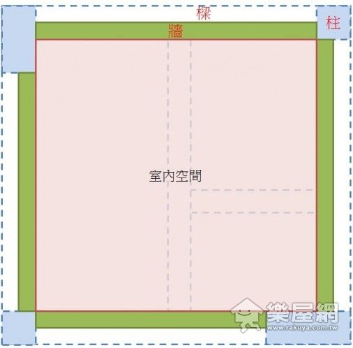 先從以往較常見的非樑柱外露的建造方式說起。若將牆建造的較靠近外側,則樑柱就不會外露,如下圖: