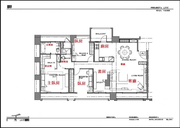 以下為六十坪的平面圖。從圖得知其隔局相十分方正,每個空間規劃適中,不會特別小或哪間特別大的極大落差。