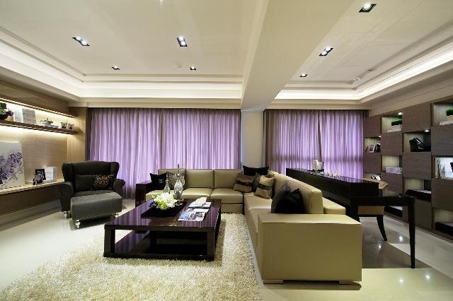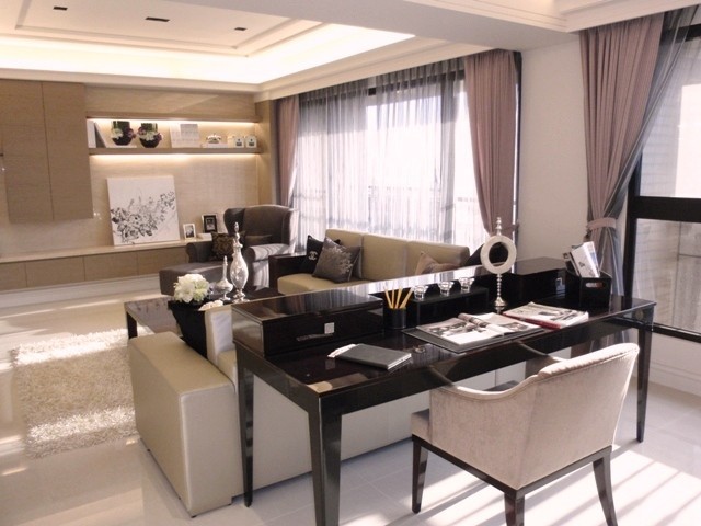 六十坪的隔局採自由規劃式,基本是三房,但可根據買家需求再自行隔到四房。不過,從寬敞的客廳到後方的書房(可單獨隔為一房),加上前陽台全落地窗戶的設計,讓原本客廳的觀感更為氣派。透過後方的書房擺設為客廳增添書卷氣,有別於一般單重視交誼的客廳功能,更具多元化。