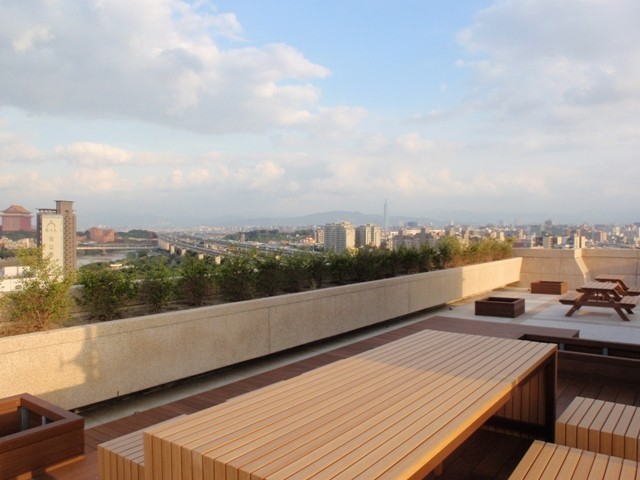 美景絕不僅於此!到頂樓的花園區,抬頭一看特藍的天空,瞬間心情都開朗了起來!而且,一邊遠眺淡水河,一邊則見基隆河!