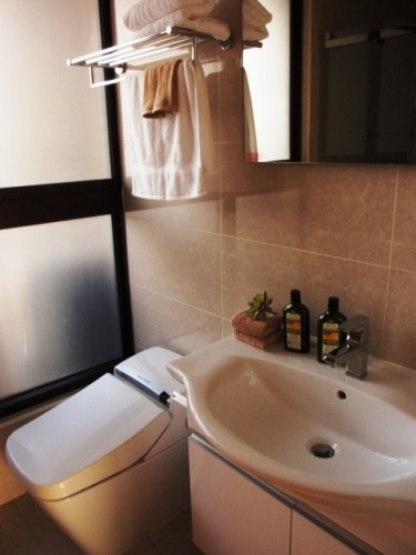 強調衛設備採用杜拜帆船飯店的設備及規格。瞧~~這可是免治馬桶,一早起來或冬天上廁所不再屁股冷支支!而且萬一忘了帶衣服進浴室,洗完彭彭,也能立刻一旁的更衣間穿上衣服真方便!