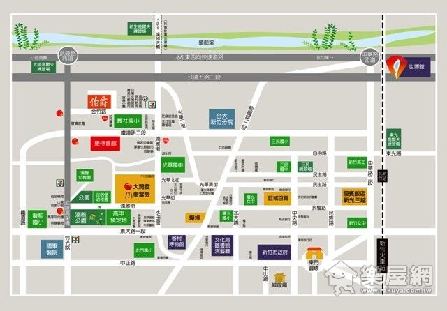 從地圖發現,富宇伯爵周遭除了具備優質的生活機能外,還有舊社國小、光華國中環繞,未來小朋友高中也有新竹女中或者到市區就讀清華大學、交通大學亦有便捷的交通路線可到達。屬於「漸向式」的社區型式,從寧靜的住宅區、往外的文教區、到商店區及到市中心的漸進式,兼備了單純的住宅及商圈的生活便利性。。