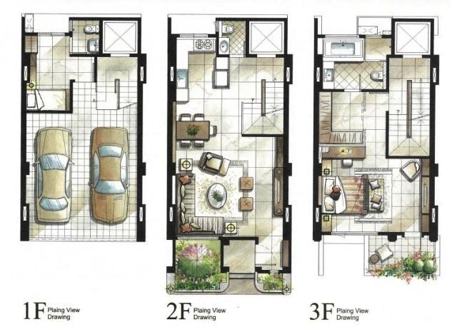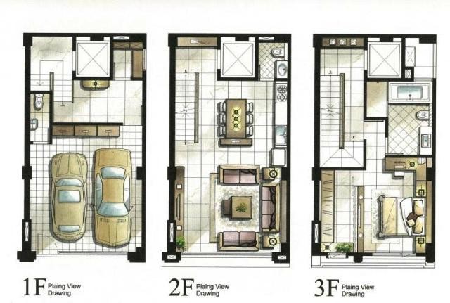 如下圖所示,住家部分:一樓為車庫加一個房間(可做為儲藏屋、佣人房等用途)、二樓為客、餐廳加廚房、三樓為主臥室、四樓一間房間、五樓為一間房。