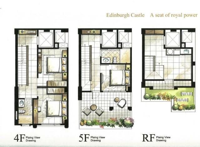 如下圖所示,愛丁堡為五樓半的樓層規劃。五樓前半部有個小露台,後面還有一間房間。