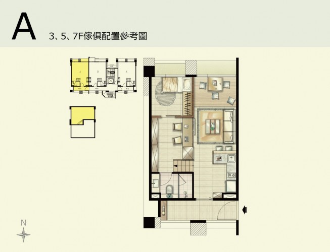 ↑↑↑A戶平面規劃:從「此圖」的左下方小圖顯示A戶為客、餐廳3米,臥室為四米二的配置,即為下樓梯的部分。