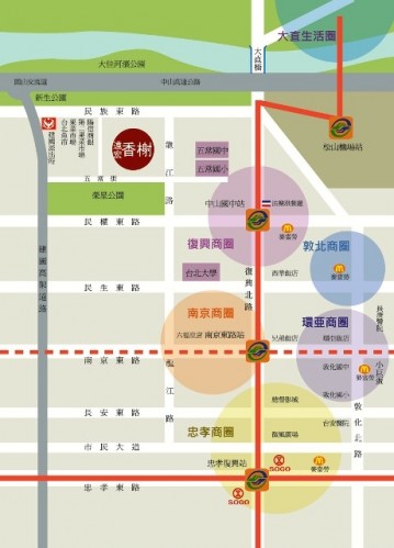 ↑↑↑交通生活機能圖。遠宏香榭可謂開門見財,前門正面對陽信商銀,走出去約2-3分在民族東路交叉口有五常市場,在民族東路口還有更大型的果菜市場及台北漁市滿足婆婆媽媽們的買菜需求。