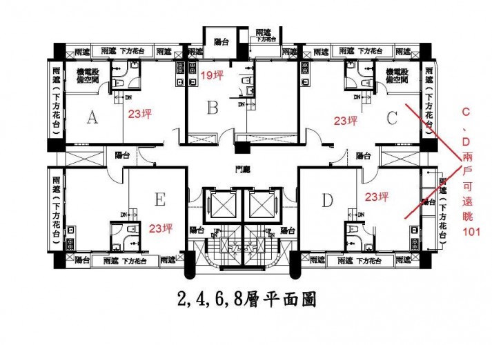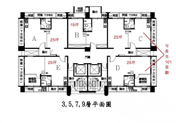 如圖所示五併的規劃,B戶為19坪,其餘A、C、D、E在偶數樓為23坪,奇數樓則為25坪。而頂樓的2戶則為樓中樓65坪。C、D住戶能遠眺101,A-C戶有象山為靠,往A戶方向直走則為糶米古道。可謂群山環抱、空氣清新。