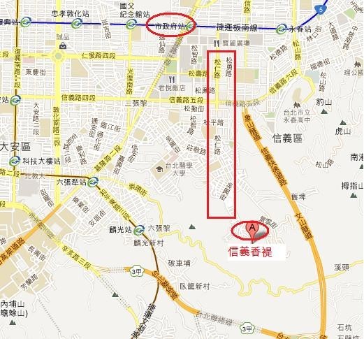 信義香褆位於信義區吳興街600巷弄之中。其實從捷運市政府站往松仁路直走到松仁路315巷亦可抵達。若搭乘大眾交通工具可坐到捷運市政府站,然後再轉接有到吳興街公車總站的任何一班公車皆可到基地地址。