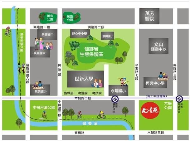 尚青苑就位於考試路上的木柵路一段與辛亥路七段的木柵公園交叉口。除剛提到的考試院,還有旁邊的木柵公園、再興中小學、文山運動中心、世新大學圍繞,往興隆路方向更有嚴謹治學的著名私校靜心中小學、再興中小學。雖然少了熱鬧的繁華夜景,但卻也添了幾分書香氣息。小編老實說從辛亥路七段一路走來到木柵路,單純的住宅加上學區的環繞瞬間有讓人進入靜心沉思的悠然心境。