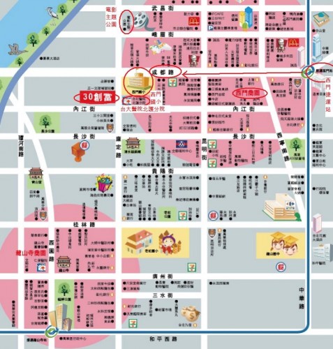 「30創富」位於萬華區的康定路上。如果你聽過西門電影公園的話,對於這兒一定不陌生。如下圖所示,從捷運西門站一號出口出來延著成都路直走經過西門國小後左轉後則為30創富建址。沿途中會經過大家耳熟能詳的萬年大樓、西門町及商圈鬧區域,但一轉入成都路與康定路交叉的西門國小後則為鬧中取靜的住宅區。