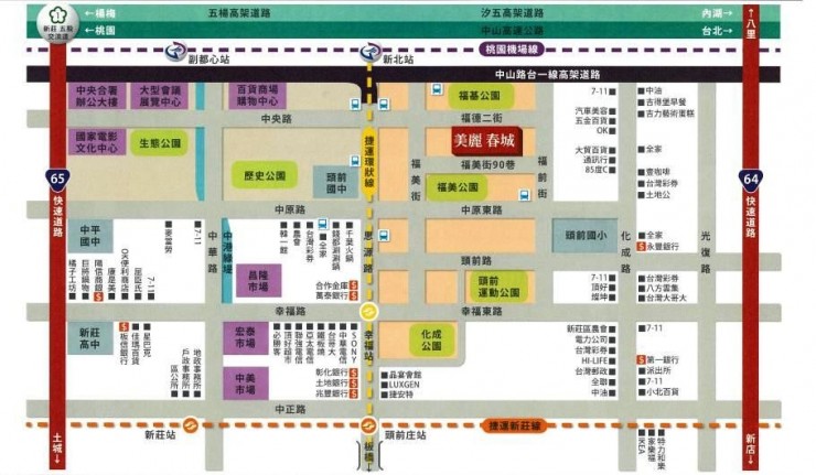 如下圖所示,美麗春城除了位於有便利的交通點上,前後還有福基公園、福美公園的綠意公園圍繞。想要出門購物還有左邊昌隆、宏泰、中美市場等選擇。食衣住行育樂通通不用煩惱。