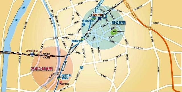 ↑↑↑藍圈為目前的新板商圈,橘圈為包含日勝幸福站的浮洲文創園區。