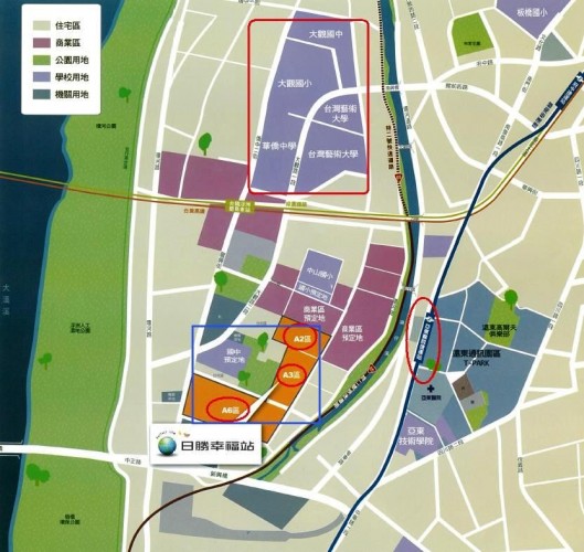 ↑↑↑紅框內為目前大觀路一段台藝大向外擴散主要生活圈,藍框為未來日勝幸福店區域。紅色圈地部分為捷運亞東醫院站。