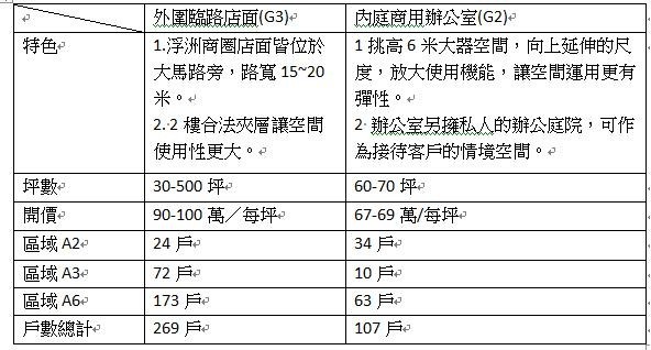 這次的店面及辦公室特區部分,其外圍臨路店面連同A2、A3、A6東、西兩側等三大區域共計269戶,其坪數從小而美的30坪小店面到500坪的大型賣場坪數都有。平均開價為每坪90-100萬左右,比起北市或新北其他金店面的上億店面價顯得平易近人。目前三大區店面中,以較靠近捷運亞東醫院站的A2、A3區域的店面最為搶手,而A7區因有最多棟數因素之下,不但戶數多相對的選擇性也較多。除店面外,倘若預算不多買不起外圍臨路店面的話,還有內庭商用辦公特區平均每坪60萬起跳的挑高辦公特區做為第二選擇,不但可以做為店面營業還可當作一般住宅居住使用。