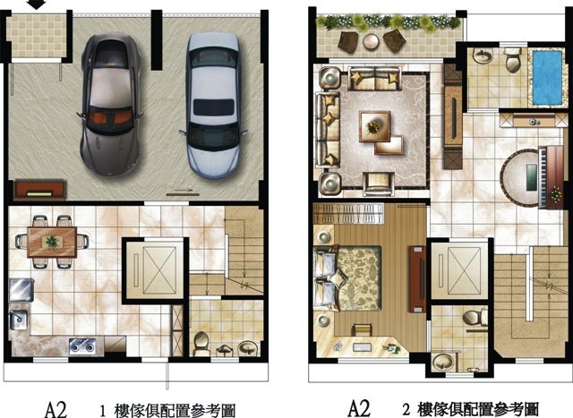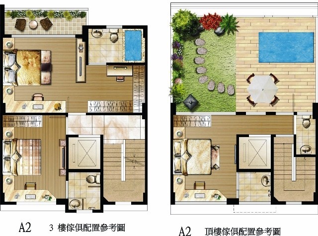 A2的三樓同A6,但4樓部分的庭園規劃稍顯不同,多了小降板式水池。