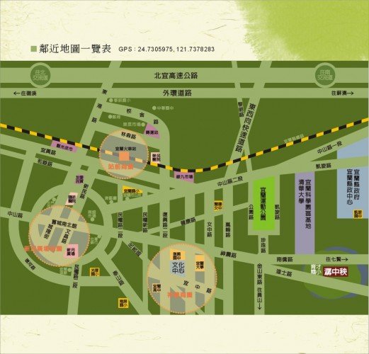 從宜蘭市火車站到潺中秧建案一路會經過站前商圈、新月商圈、宜蘭大學附近的神農商圈。從宜蘭大學到潺中秧開車約莫4-5分左右不到車程。生活機能方便之外,同時對面的宜蘭運動公園、及未來即將進駐的宜蘭科學園區(約600公尺)及清華大學宜蘭分校(約500公尺)都在這個區域之內。
