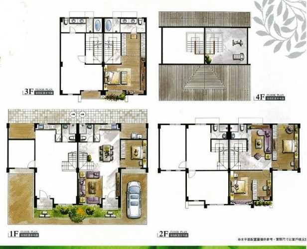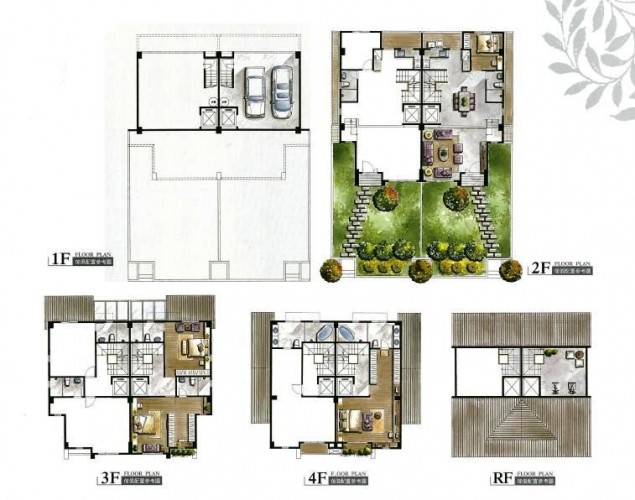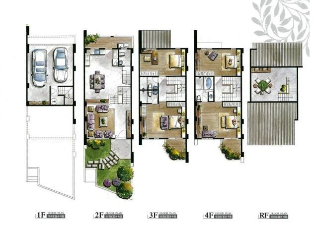 A棟有3.5層樓,共計4房。面寬為5.3公尺。其一樓規劃為客、餐廳加一個孝親房,2樓2個房間及一個客廳,3樓為大主臥,頂樓則為閣樓部分。