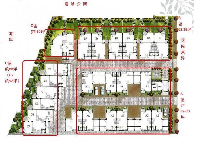 基地面積1304坪,分為A、B、C、D四棟, 戶數共有23戶。共有連棟、雙併、及獨棟式的建築。坪數從68-160坪不等。如下圖:A區共10戶,為68坪連棟式別墅,為3.5層樓。B棟有6戶,為98坪為雙車位,電梯式的雙併別墅。其面對運動公園。C棟則為B棟的縮小版,共計6戶為88坪設計,最四棟中最接近湖畔景觀的一棟。D棟則為160坪唯一的獨棟電梯墅。