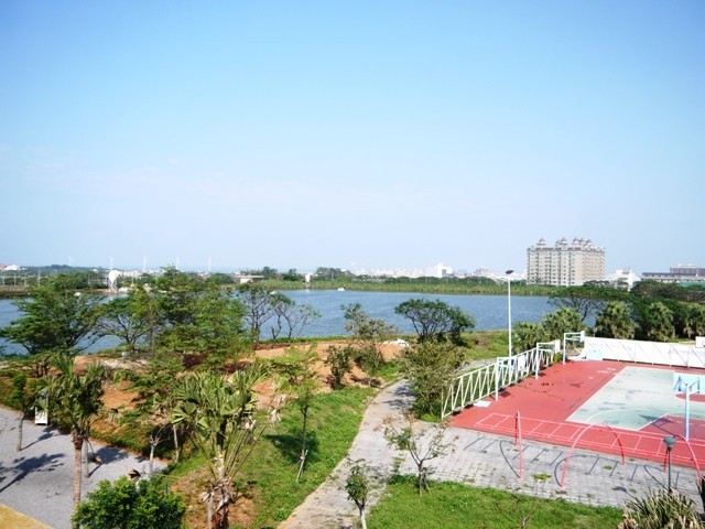 從3樓窗外放眼望去有清澈的湖畔、綠意盎然的樹林及對面的籃球運動公園。