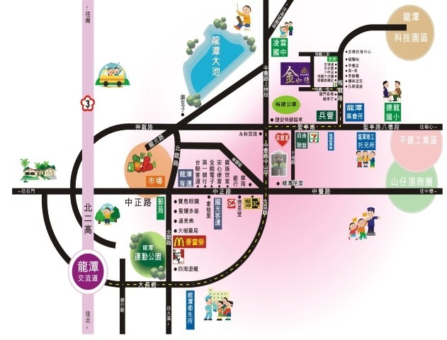 金如億從左邊北二高龍潭交流道下3公里即可到達。離龍澤市區商圈車程約3分,附近鄉立托兒所,國中小學都有專車接送,省掉接送時間。而正對面的梅龍公園只要走路一分鐘就可以到達。另外,龍潭科學園區、著名的渴望園區均在2-5分車程內可到。生活機能、學區、交通、綠地均在周圍。